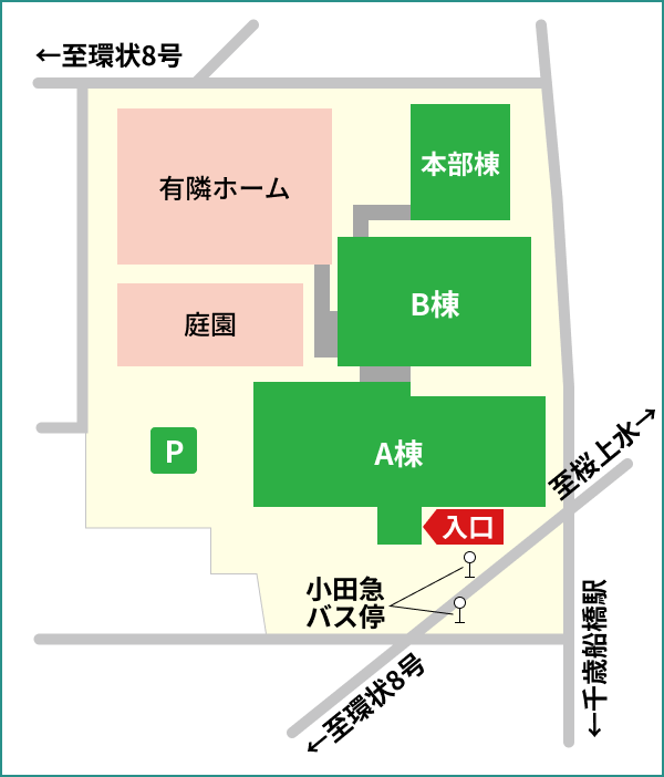 | お車 | 9月1日に新規駐車場がオープンしました。 東名・東京インター、甲州街道から環状8号線でそれぞれ15分 上記の地図、または下記の配置図をご覧ください。 |