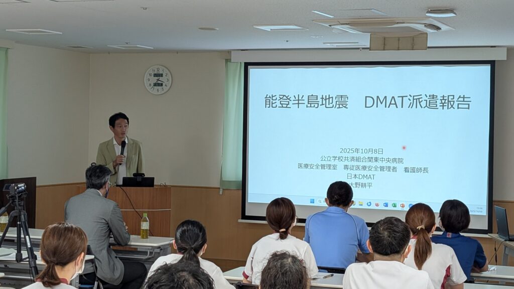 大野先生には、能登半島地震でのDMAT(災害派遣医療チーム)派遣報告についてご講演いただきました。通常と異なる心理状況での判断、意思決定の重要さや正確に情報を伝えることの大切さなどを教えていただき、災害時だけではなく、病院業務にも活かせる内容でした。また、実際の能登半島での派遣において、市街の様子やトイレの問題、派遣されて行った活動など、普段の病院間連携では知ることができない関東中央病院の活動を知ることができ、とても勉強になりました。