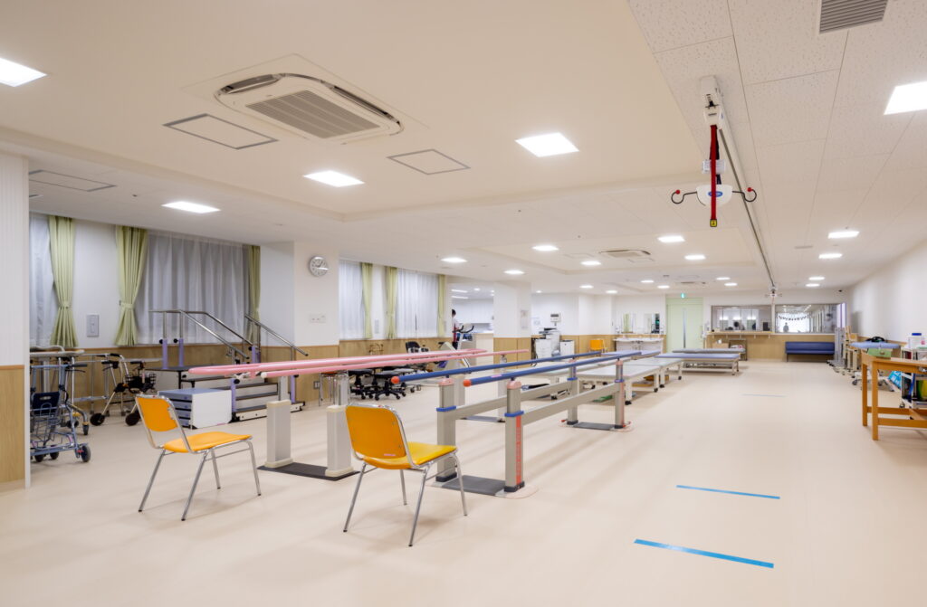 リハビリ室は2部屋あり370㎡と150㎡と合わせて520㎡あります。全国平均(2021年度実績)は481.3㎡となっており、都内にありながら非常に広いスペースでリハビリが行えます。